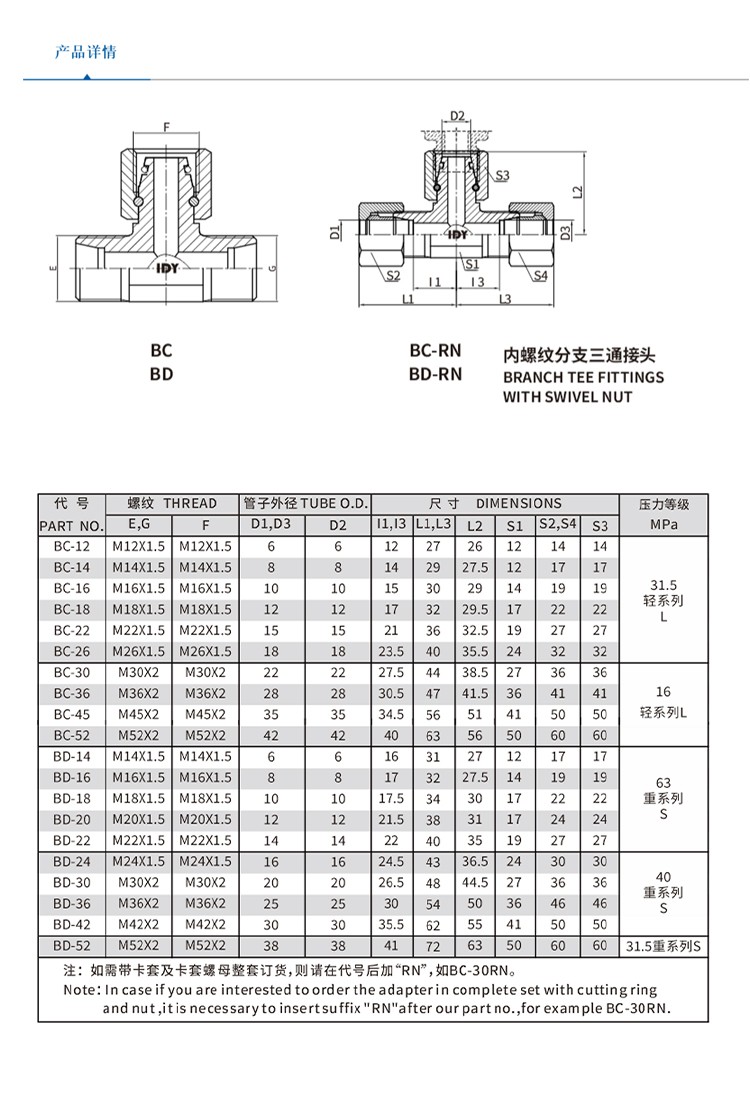 依得力液压过渡接头公制卡套接头内螺纹分支三通接头