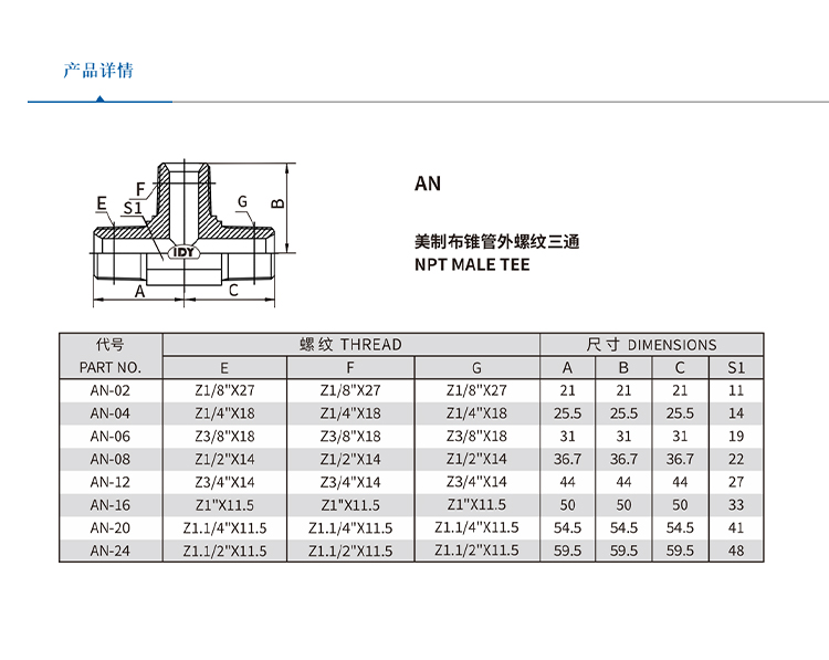 依得力液压过渡接头美制锥管螺纹NPT接头美制布锥管外螺纹三通