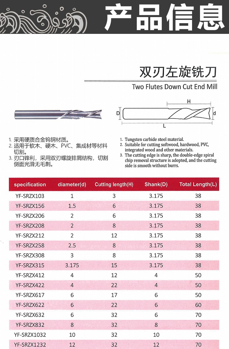 双刃左旋铣刀 适用于软木、硬木、PVC、集成材等材料 切割