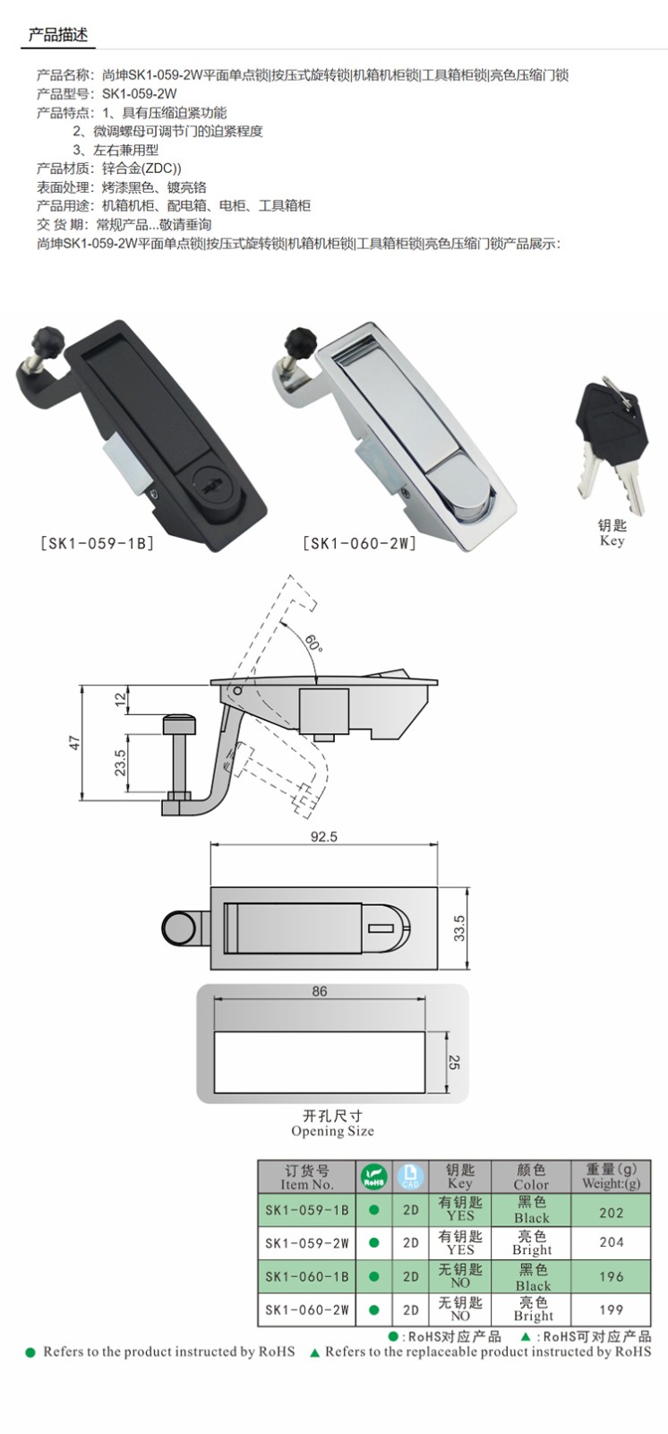 尚坤SK1-059-2W平面单点锁按压式旋转锁机箱机柜锁工具箱柜锁亮色压缩门锁