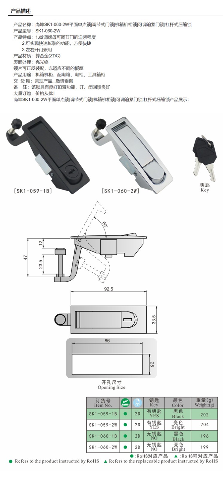 尚坤SK1-060-2W平面单点锁调节式门锁机箱机柜锁可调迫紧门锁杠杆式压缩锁
