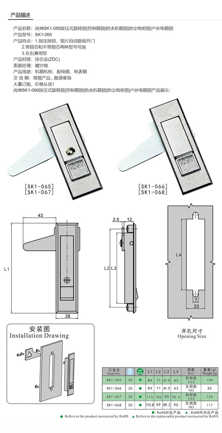尚坤SK1-066按压式旋转锁控制箱锁防尘电柜锁防水机箱锁户外电箱锁