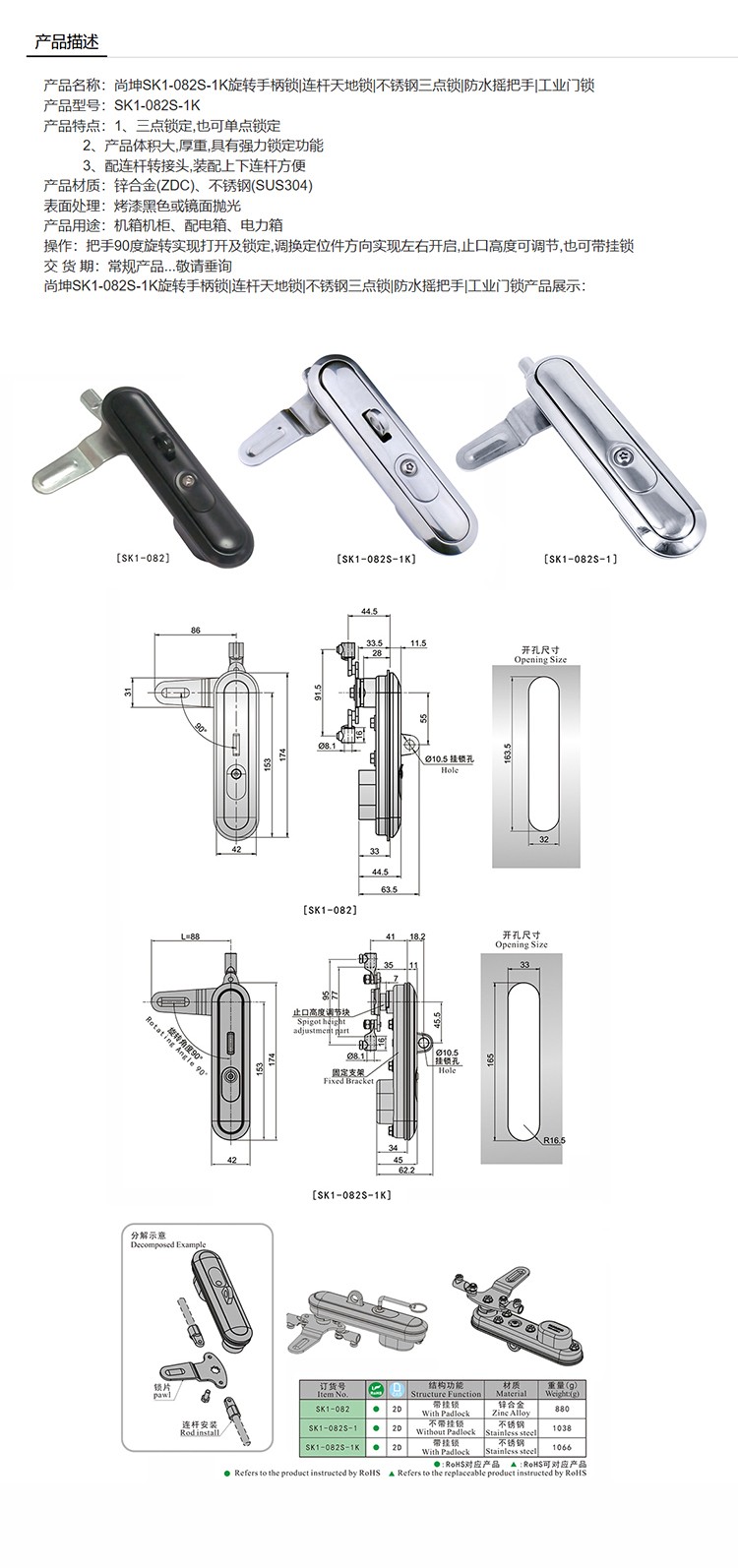 尚坤SK1-082S-1K旋转手柄锁连杆天地锁不锈钢三点锁防水摇把手工业门锁