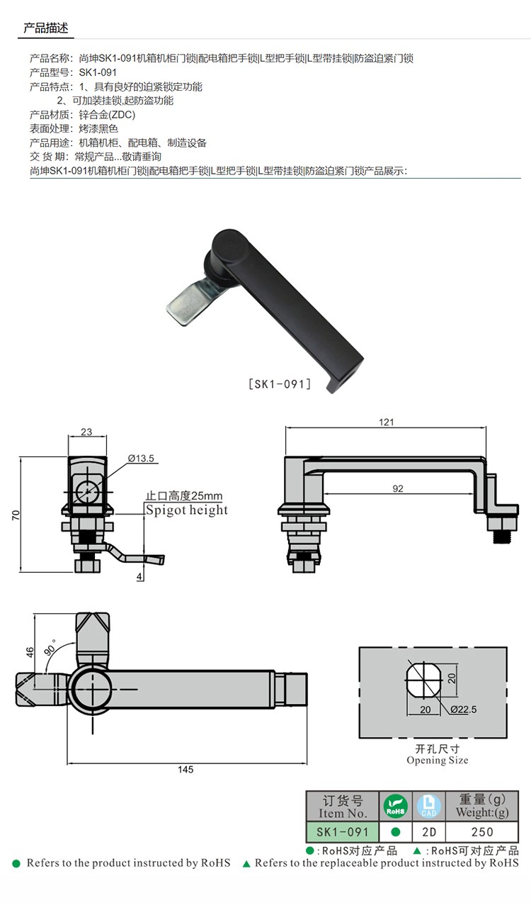 尚坤SK1-091机箱机柜门锁配电箱把手锁L型把手锁L型带挂锁防盗迫紧门锁