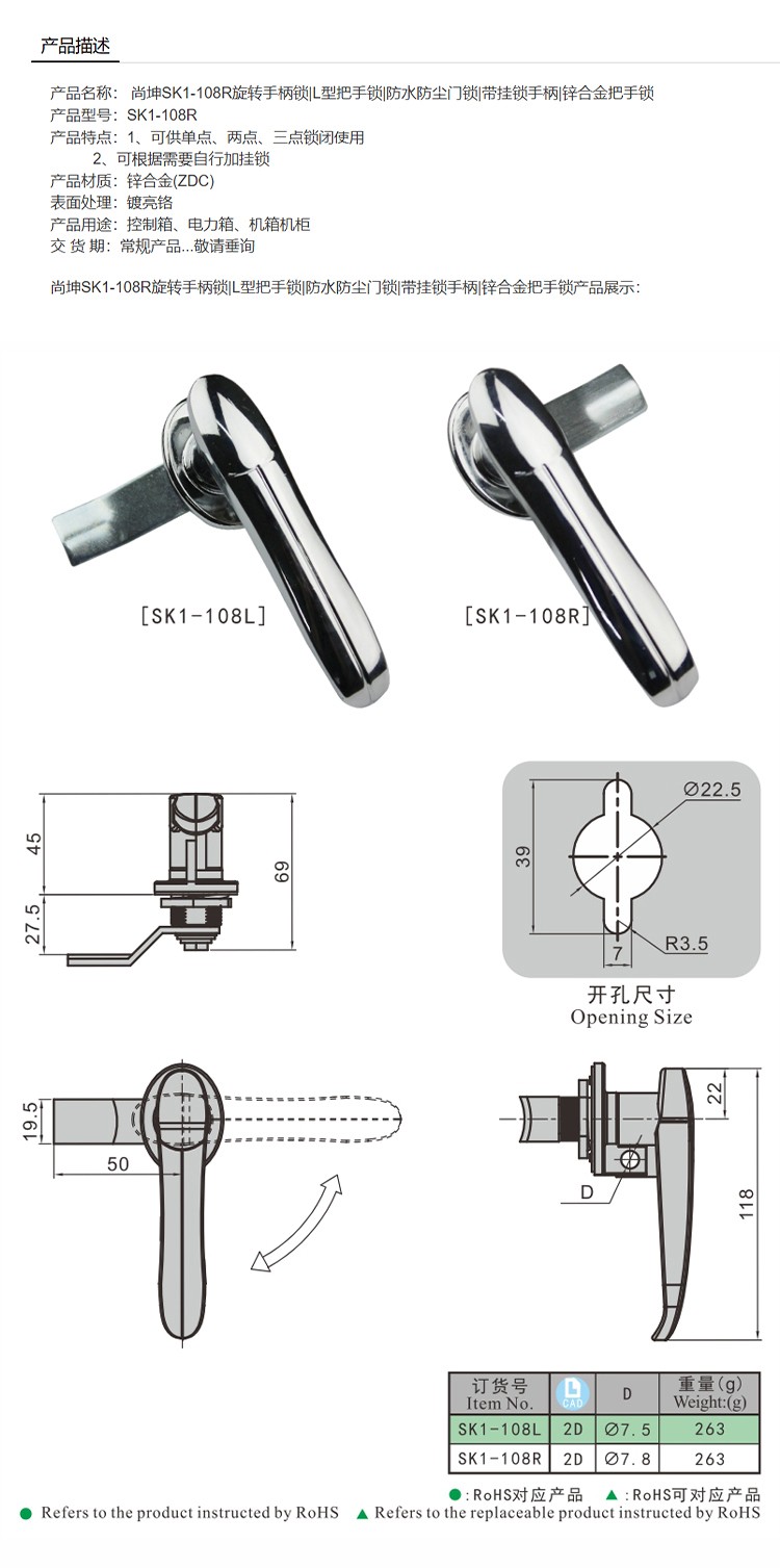 尚坤SK1-108R旋转手柄锁L型把手锁防水防尘门锁带挂锁手柄锌合金把手锁