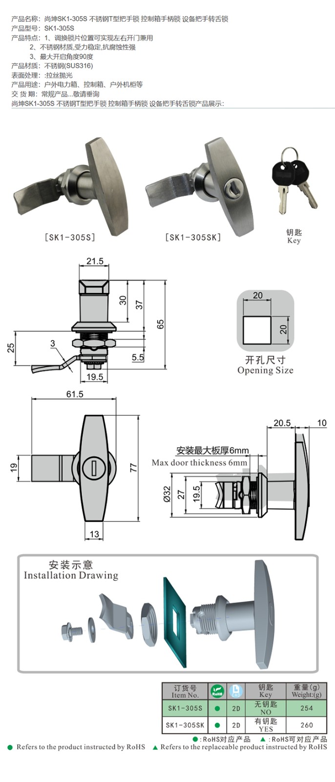 尚坤SK1-305S 不锈钢T型把手锁 控制箱手柄锁 设备把手转舌锁