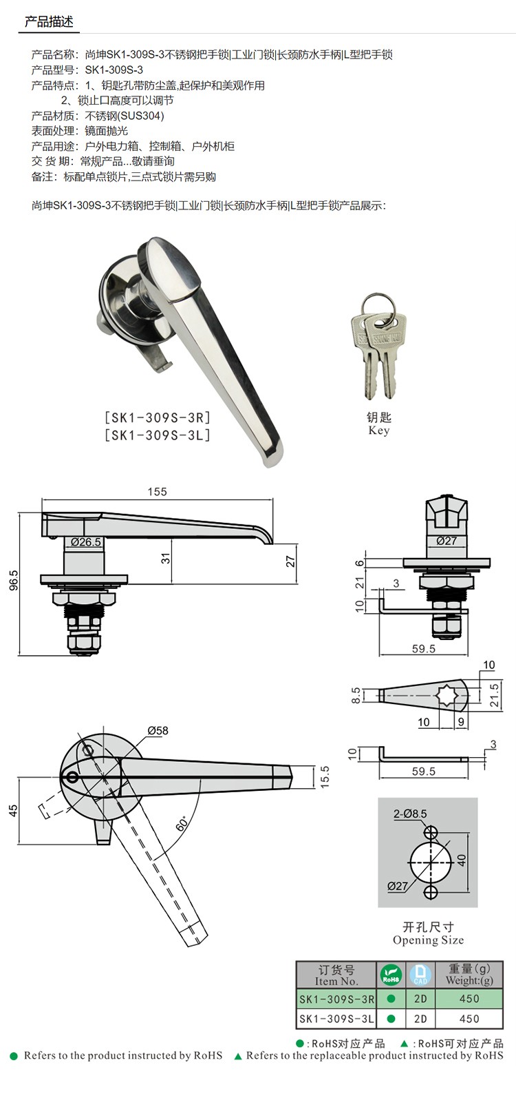 尚坤SK1-309S-3不锈钢把手锁工业门锁长颈防水手柄L型把手锁