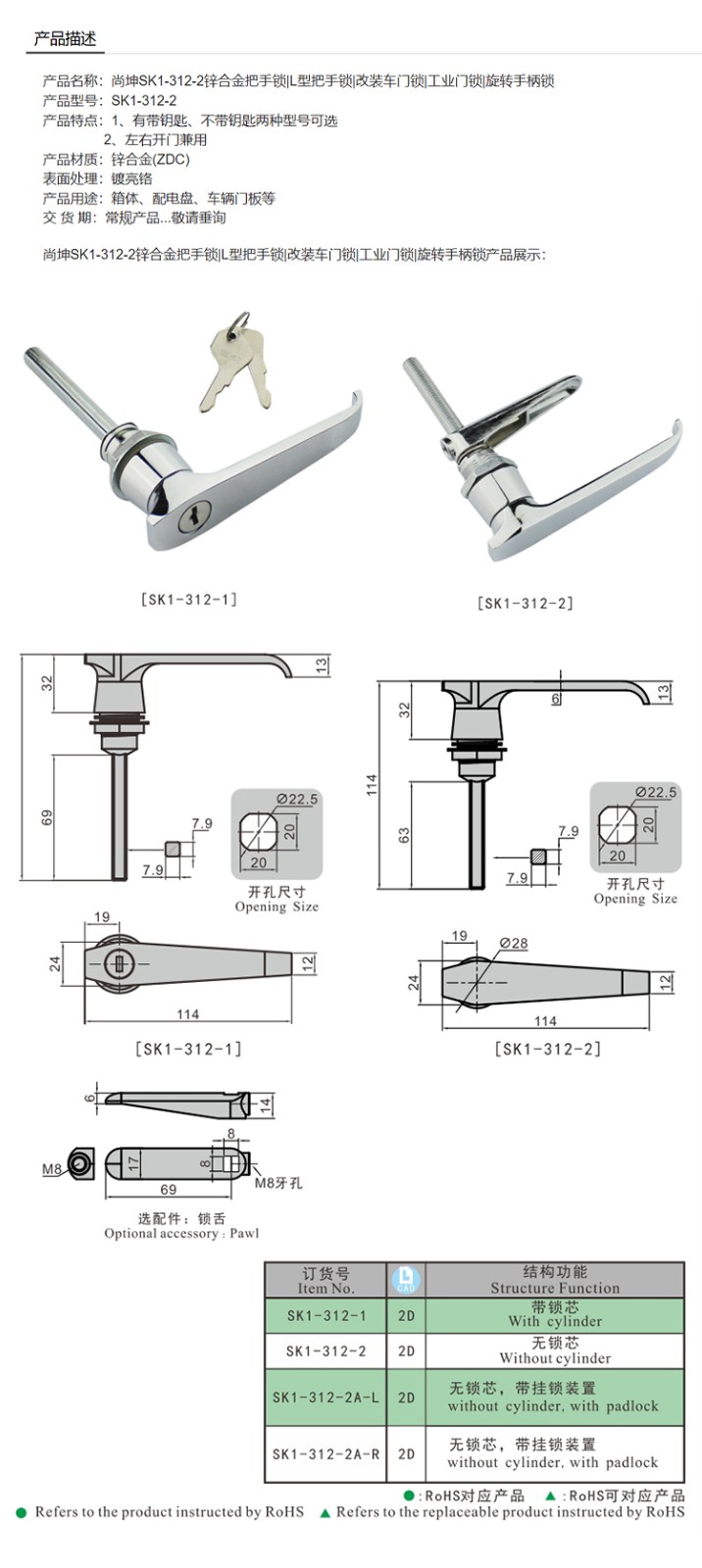 尚坤SK1-312-2锌合金把手锁L型把手锁改装车门锁工业门锁旋转手柄锁