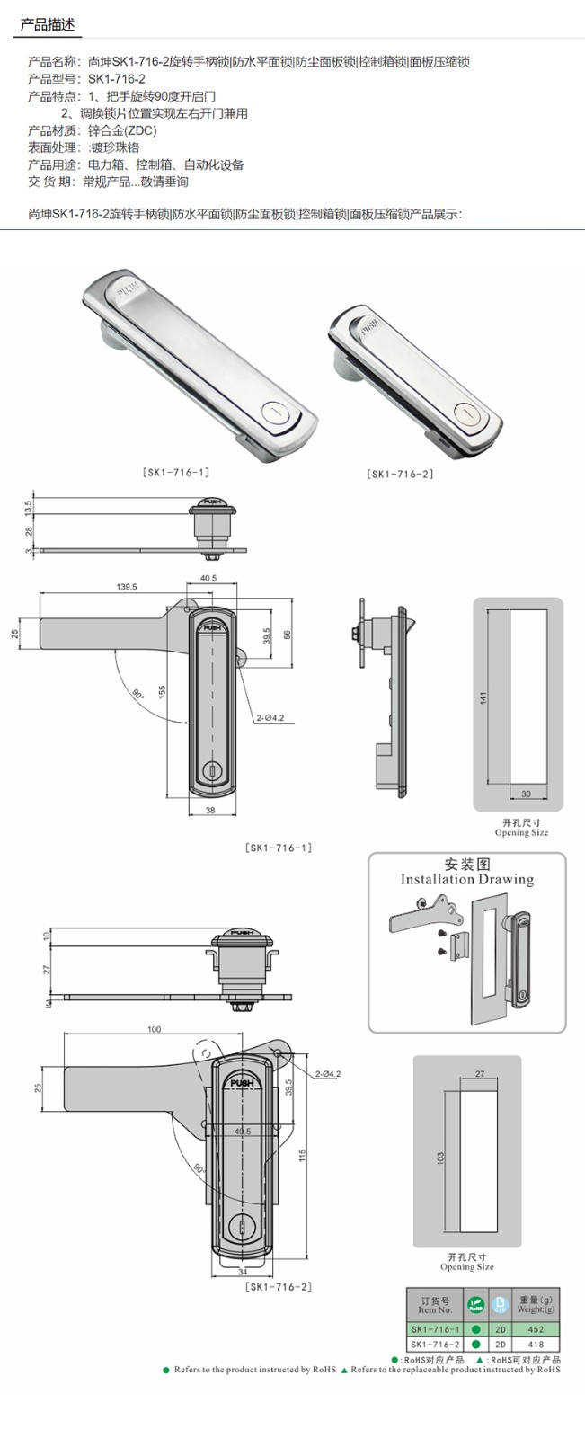尚坤SK1-716-2旋转手柄锁防水平面锁防尘面板锁控制箱锁面板压缩锁