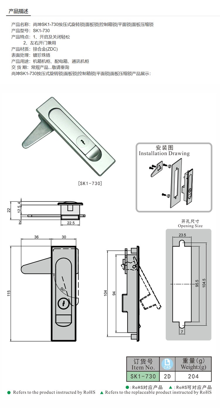 尚坤SK1-730按压式旋转锁面板锁控制箱锁平面锁面板压缩锁