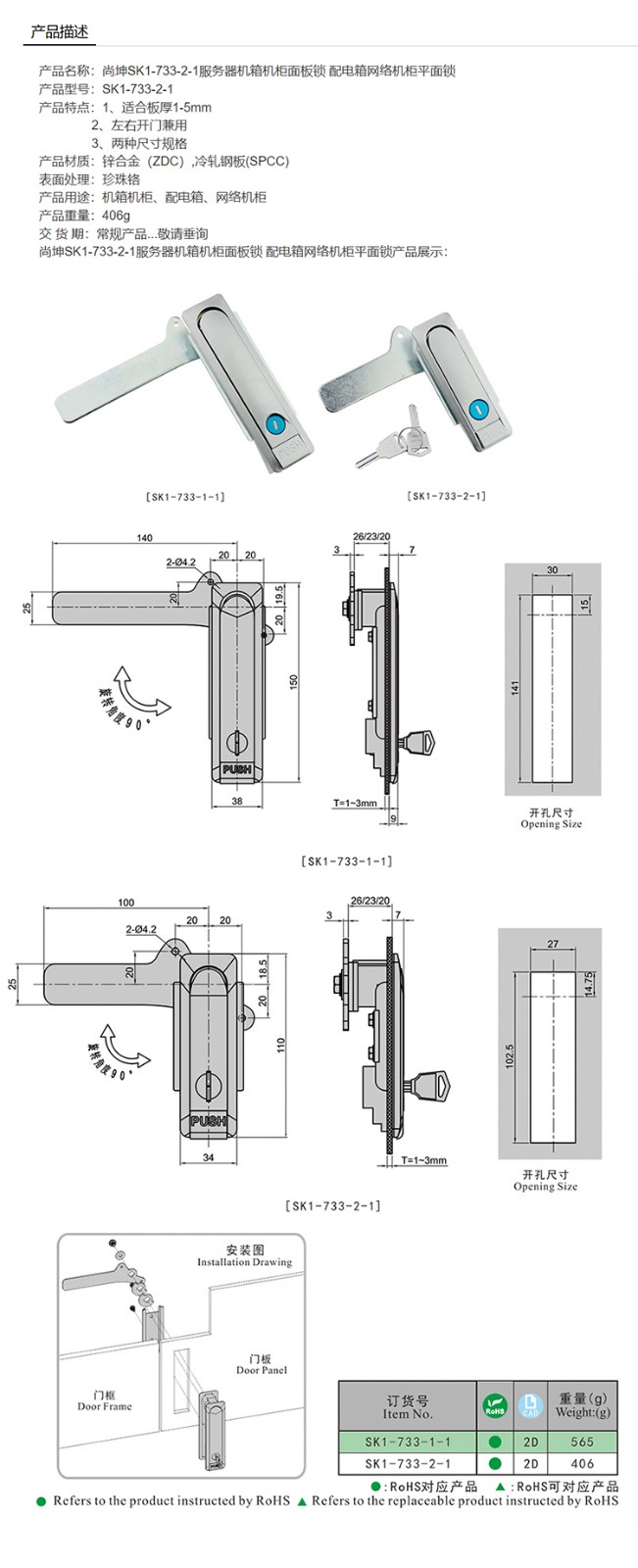 尚坤SK1-733-2-1服务器机箱机柜面板锁 配电箱网络机柜平面锁
