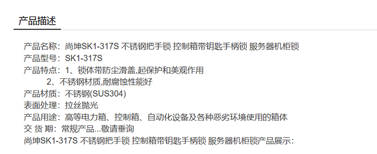 尚坤SK1-317S 不锈钢把手锁 控制箱带钥匙手柄锁 服务器机柜锁