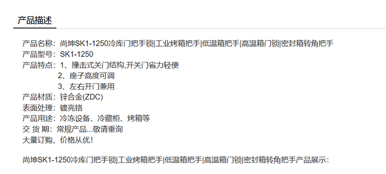 尚坤SK1-1250冷库门把手锁工业烤箱把手低温箱把手高温箱门锁密封箱转角把手