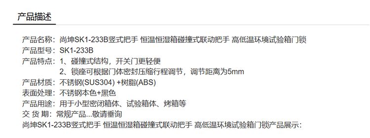 尚坤SK1-233B竖式把手 恒温恒湿箱碰撞式联动把手 高低温环境试验箱门锁