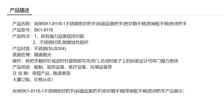 尚坤SK1-8118-1不锈钢密封把手斜面迫紧把手密封箱手柄带闸板手柄密闭把手