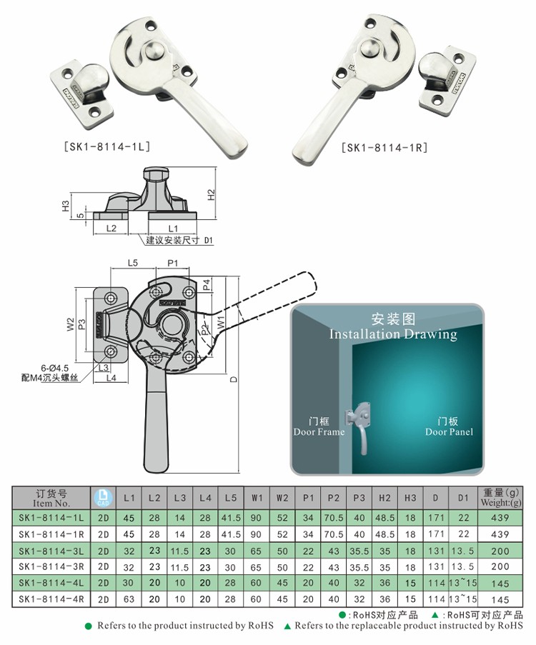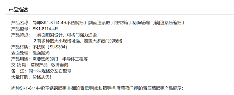 尚坤SK1-8114-4R不锈钢把手斜面迫紧把手密封箱手柄屏蔽箱门锁迫紧压缩把手