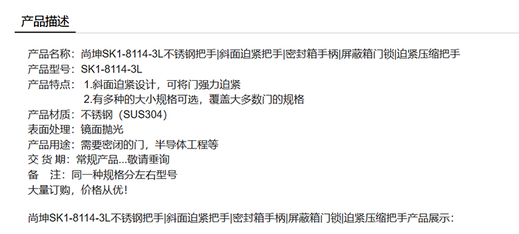 尚坤SK1-8114-1R不锈钢把手斜面迫紧把手密封箱手柄屏蔽箱门锁迫紧压缩把手