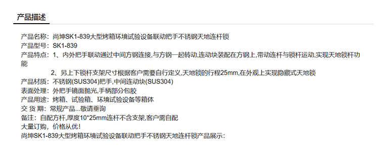 尚坤SK1-839大型烤箱环境试验设备联动把手不锈钢天地连杆锁
