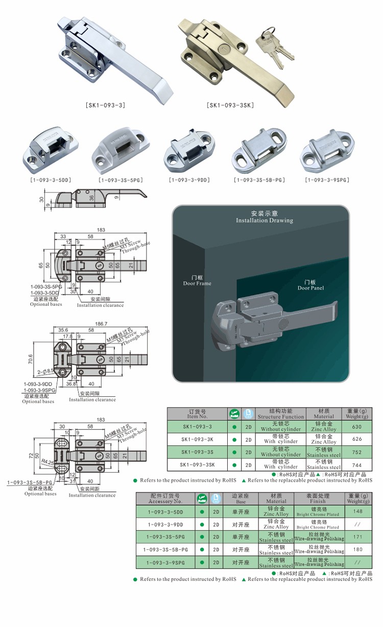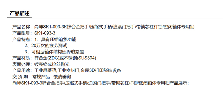 尚坤SK1-093-3K锌合金把手压缩式手柄迫紧门把手带锁芯杠杆锁密闭箱体专用锁