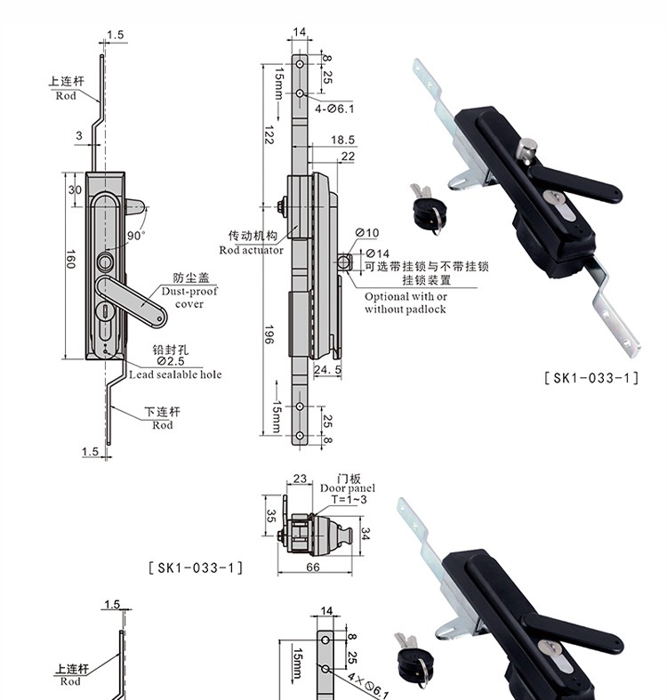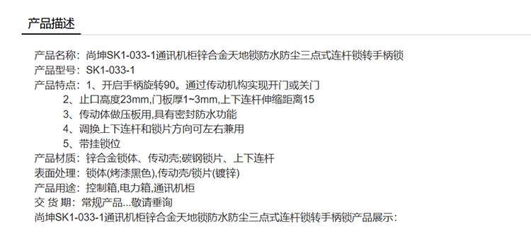 尚坤SK1-033-1通讯机柜锌合金天地锁防水防尘三点式连杆锁转手柄锁