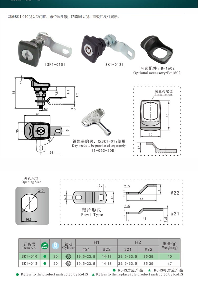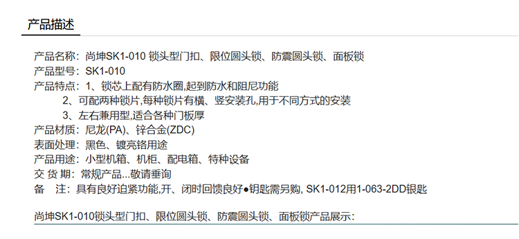 尚坤 SK1-010 锁头型门扣、限位圆头锁、防震圆头锁、面板锁