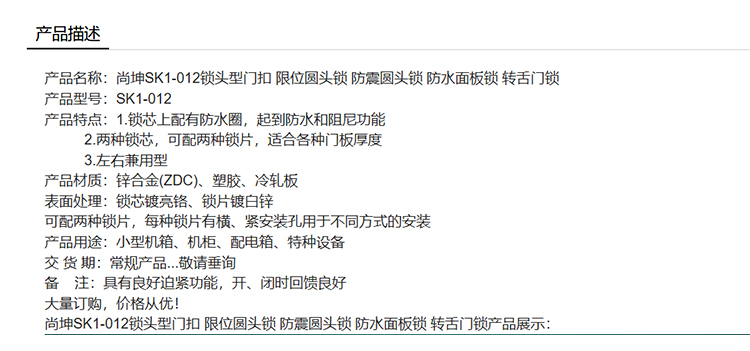 尚坤SK1-012锁头型门扣 限位圆头锁 防震圆头锁 防水面板锁 转舌门锁