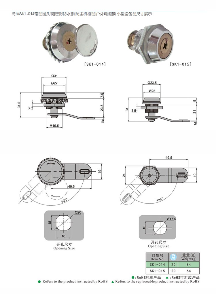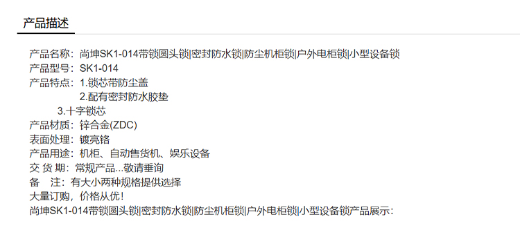 尚坤SK1-014带锁圆头锁密封防水锁防尘机柜锁户外电柜锁小型设备锁
