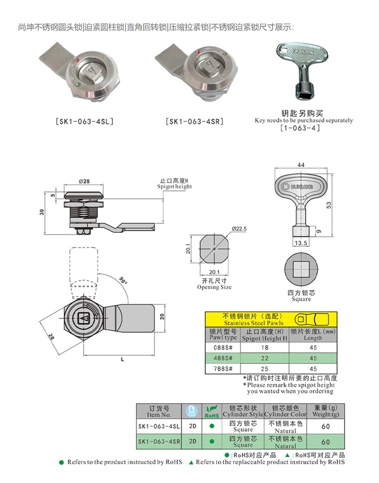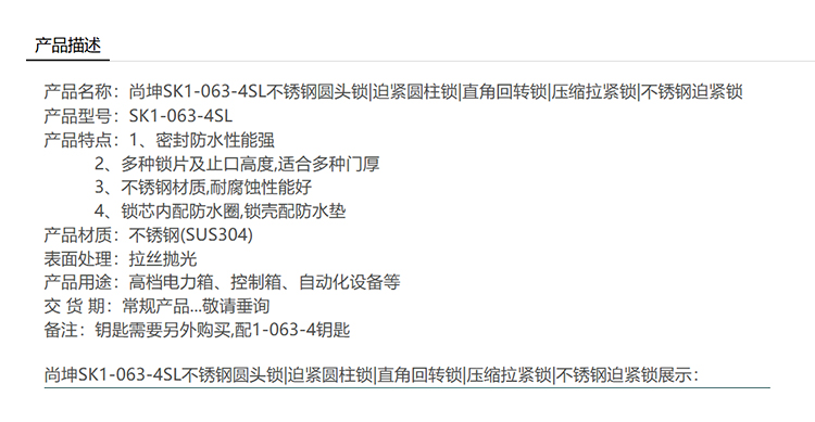 尚坤SK1-063-4SL不锈钢圆头锁迫紧圆柱锁直角回转锁不锈钢迫紧锁压缩拉紧锁