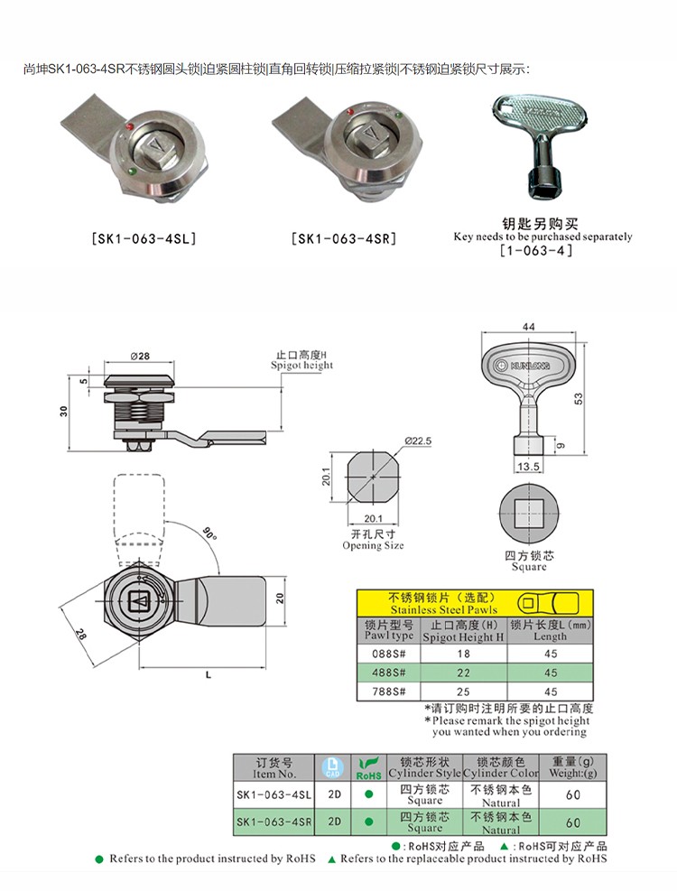 尚坤SK1-063-4SR不锈钢圆头锁迫紧圆柱锁直角回转锁不锈钢迫紧锁压缩拉紧锁