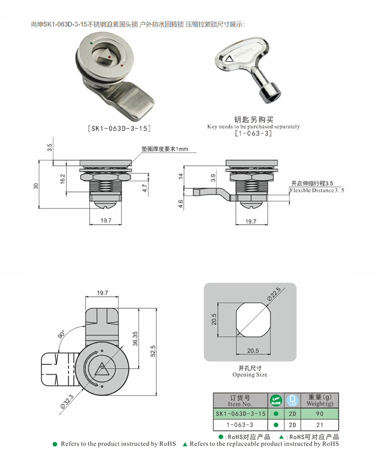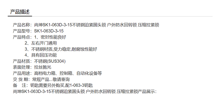 尚坤SK1-063D-3-15不锈钢迫紧圆头锁 户外防水回转锁 压缩拉紧锁