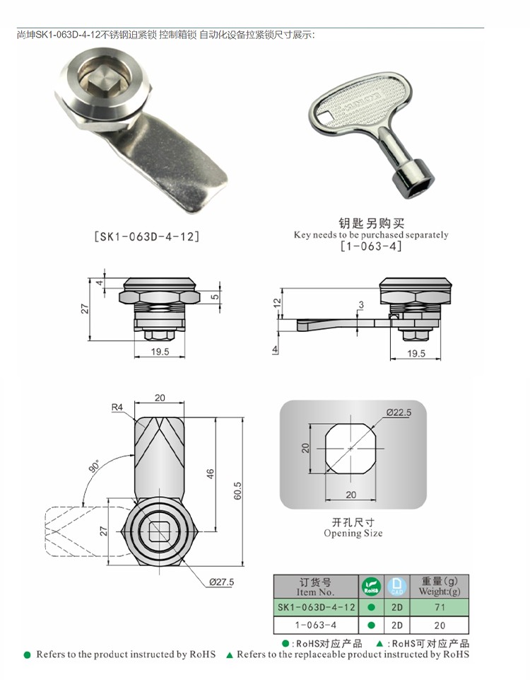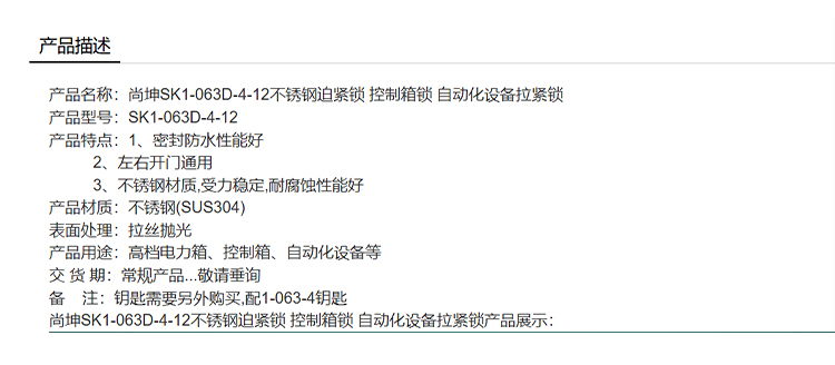 尚坤SK1-063D-4-12不锈钢迫紧锁 控制箱锁 自动化设备拉紧锁