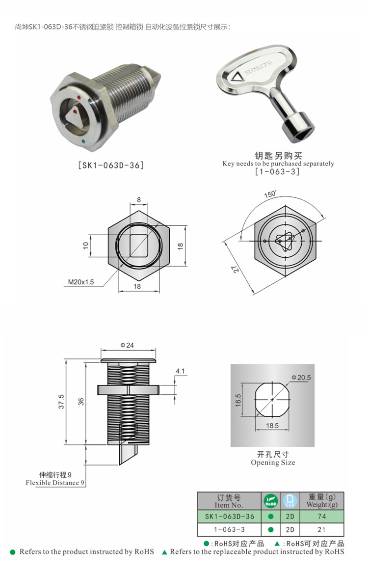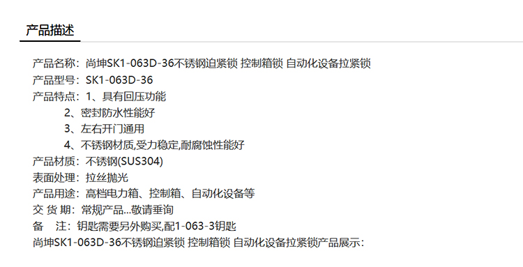 尚坤SK1-063D-36不锈钢迫紧锁 控制箱锁 自动化设备拉紧锁