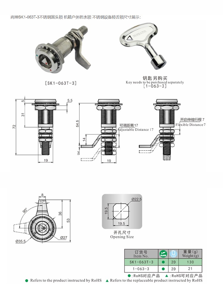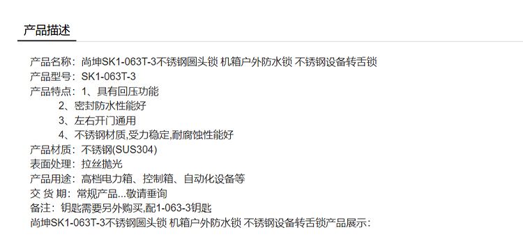 尚坤SK1-063T-3不锈钢圆头锁 机箱户外防水锁 不锈钢设备转舌锁