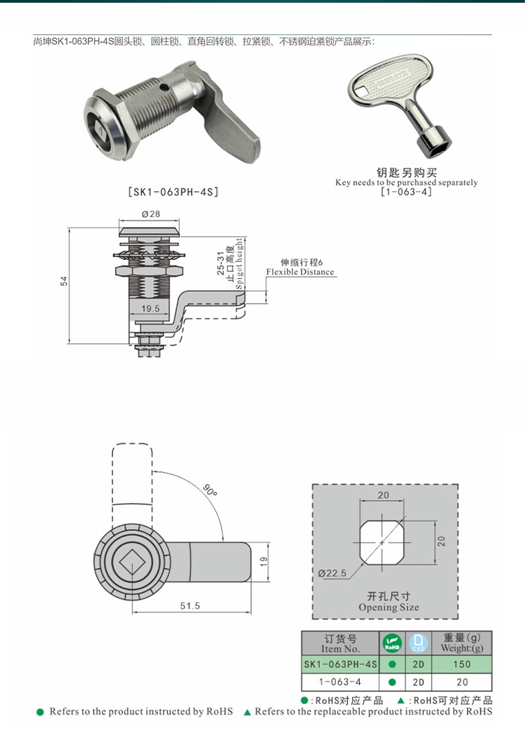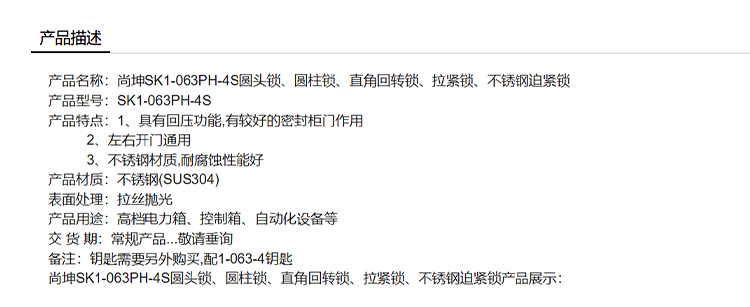 尚坤SK1-063PH-4S圆头锁、圆柱锁、直角回转锁、拉紧锁、不锈钢迫紧锁