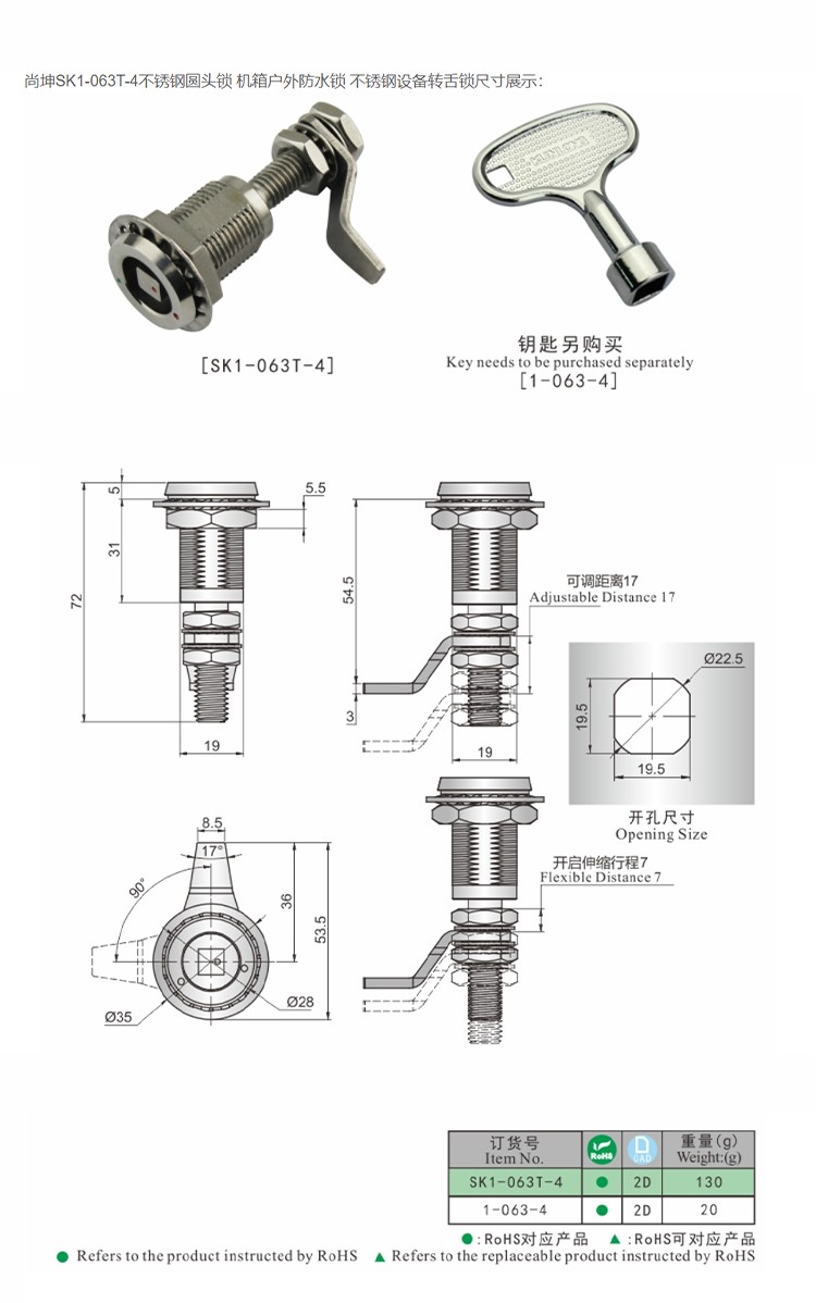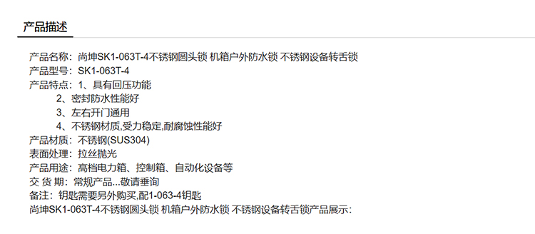 尚坤SK1-063T-4不锈钢圆头锁 机箱户外防水锁 不锈钢设备转舌锁