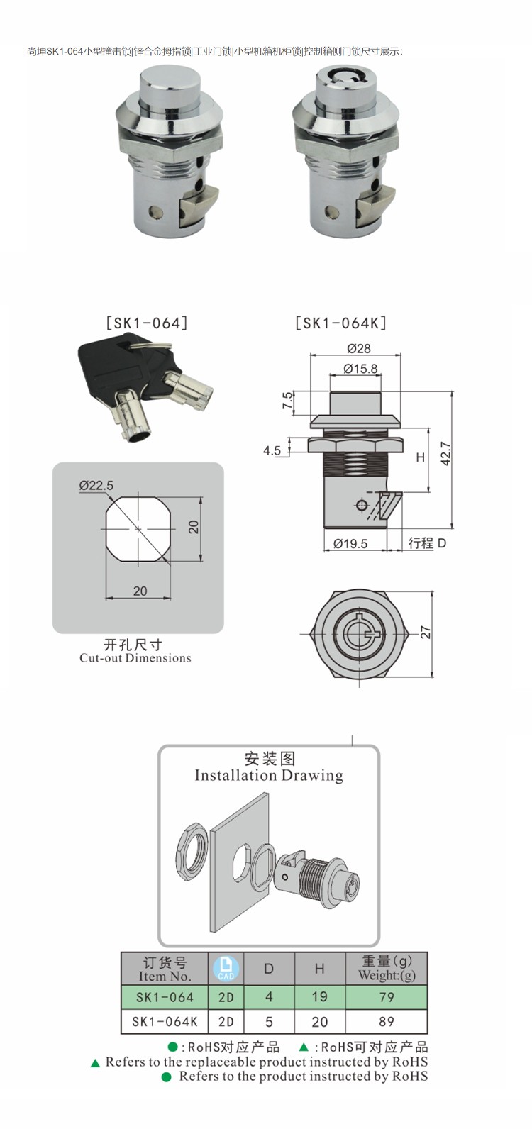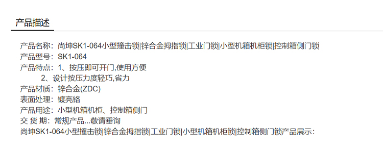 尚坤SK1-064小型撞击锁锌合金拇指锁工业门锁小型机箱机柜锁控制箱侧门锁