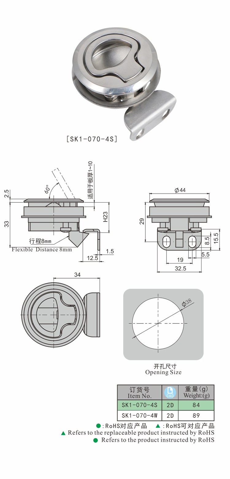 尚坤SK1-070-4S不锈钢嵌入圆头锁船舶自动化设备埋入式拉手锁
