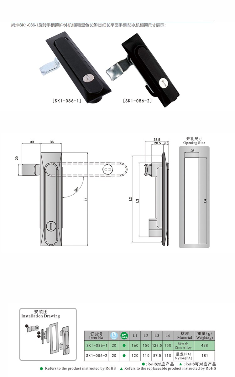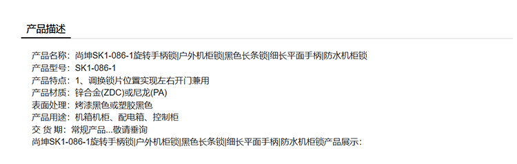 尚坤SK1-086-1旋转手柄锁户外机柜锁黑色长条锁防水机柜锁细长平面手柄