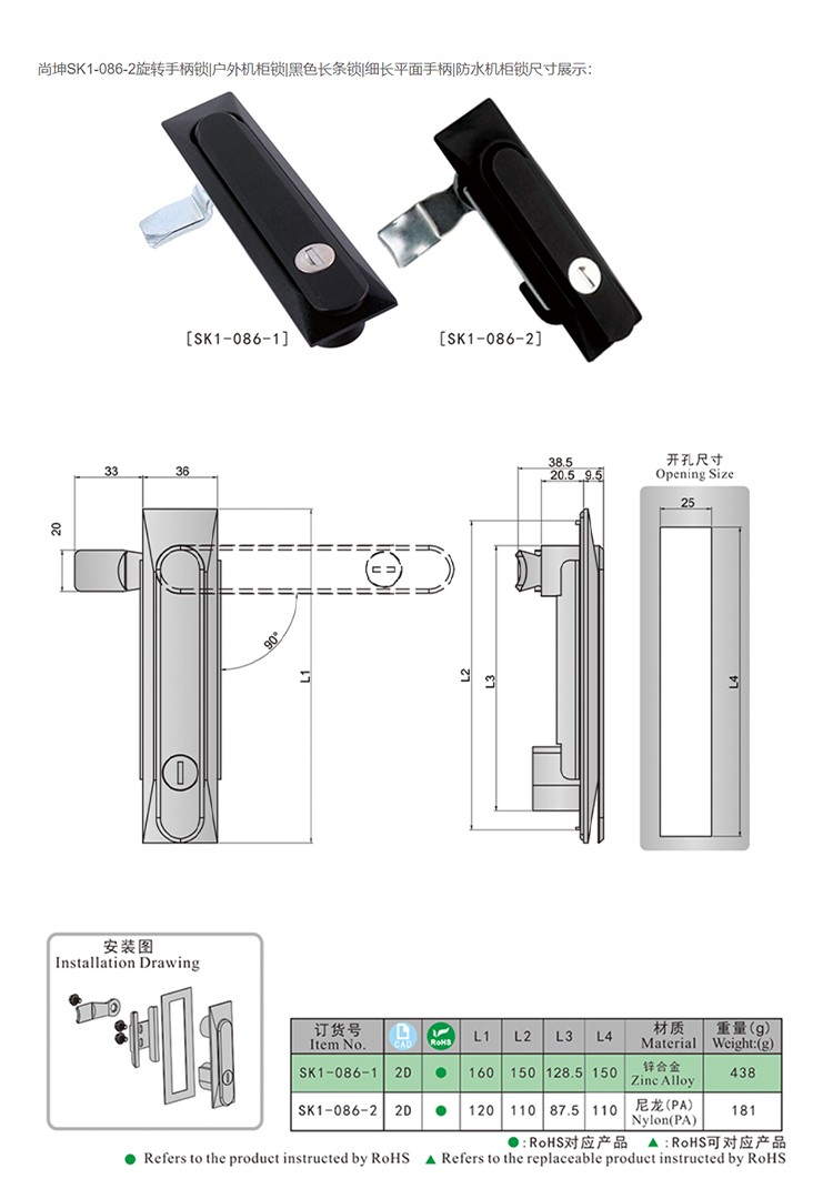 尚坤SK1-086-2旋转手柄锁户外机柜锁黑色长条锁细长平面手柄防水机柜锁