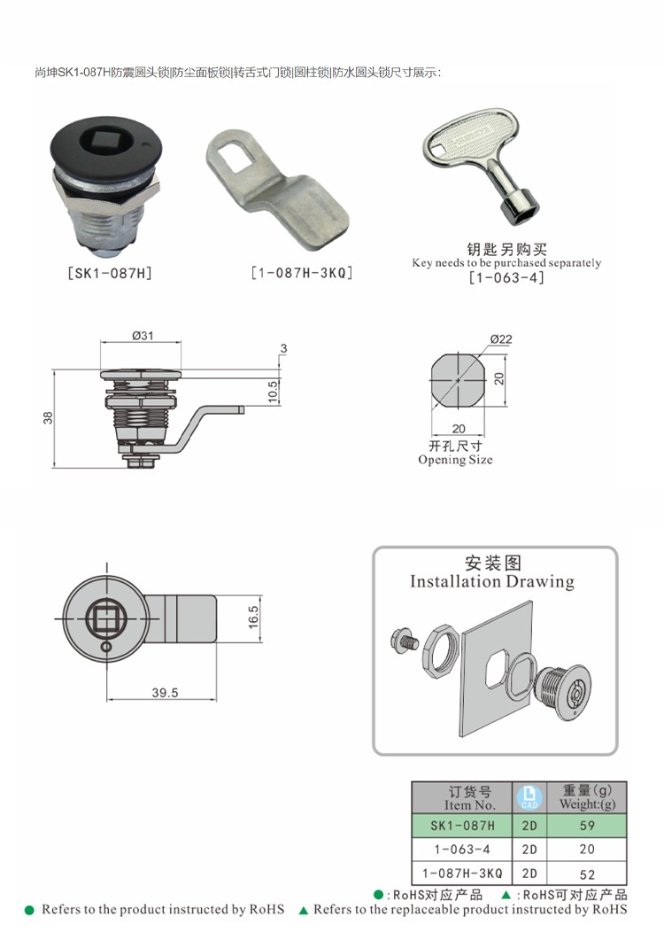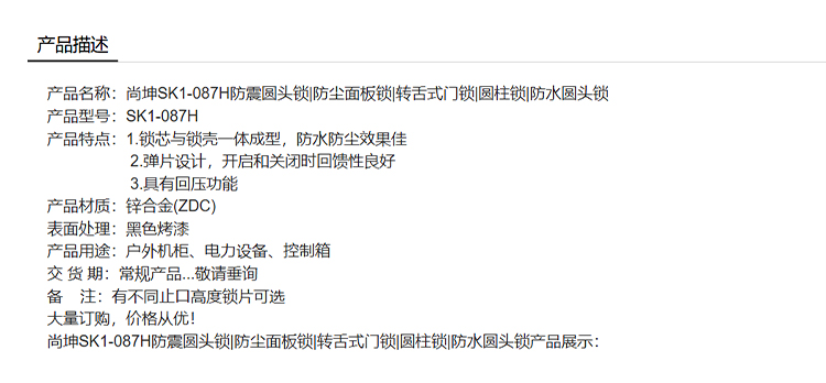 尚坤SK1-087H面板锁、防震圆头锁、转舌式门锁、圆柱锁、防水圆头锁