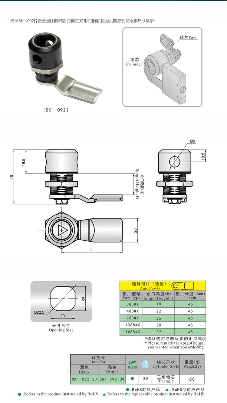 尚坤SK1-092锌合金圆柱锁转舌门锁三角形门锁机柜圆头锁密封防水锁