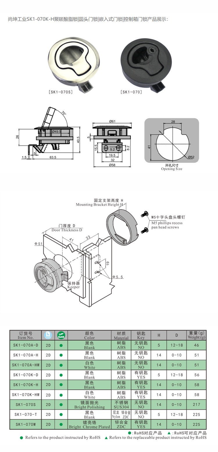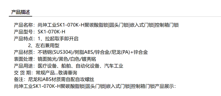 尚坤工业SK1-070K-H聚碳酸脂锁圆头门锁嵌入式门锁控制箱门锁