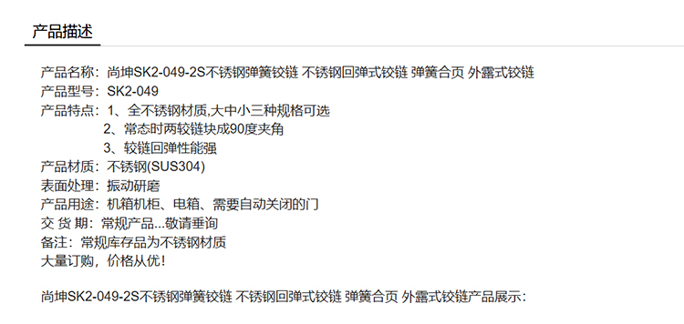 尚坤 SK2-049-2S不锈钢弹簧铰链 不锈钢回弹式铰链 弹簧合页 外露式铰链