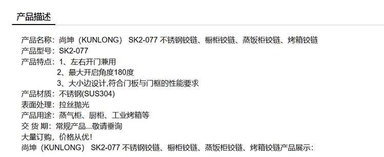 尚坤(KUNLONG) SK2-077 不锈钢铰链、橱柜铰链、蒸饭柜铰链、烤箱铰链