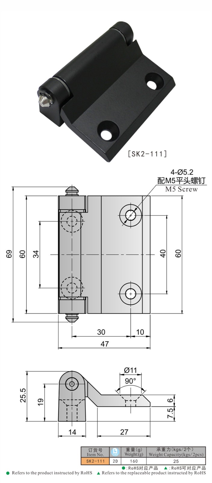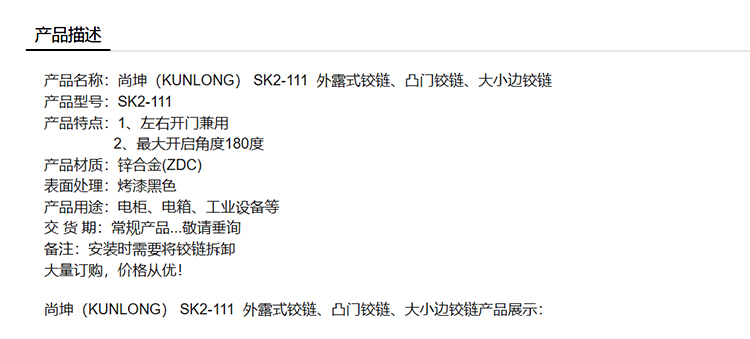 尚坤(KUNLONG) SK2-111 外露式铰链、凸门铰链、大小边铰链