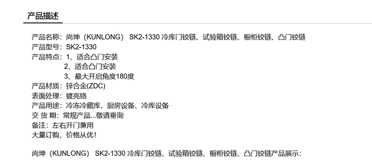 尚坤(KUNLONG) SK2-1330 冷库门铰链、试验箱铰链、橱柜铰链、凸门铰链