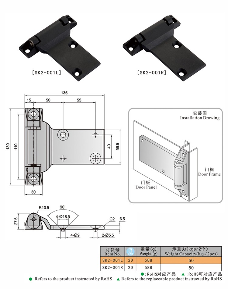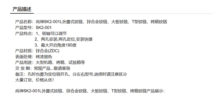 尚坤SK2-001L外露式铰链、锌合金铰链、大板铰链、T型铰链、烤箱铰链
