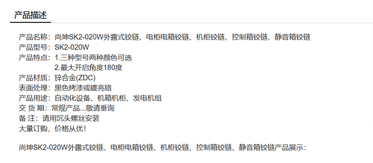 尚坤SK2-020W外露式铰链、电柜电箱铰链、机柜铰链、控制箱铰链、静音箱铰链