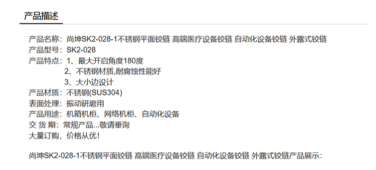 尚坤SK2-028-1不锈钢平面铰链 高端医疗设备铰链 自动化设备铰链 外露式铰链