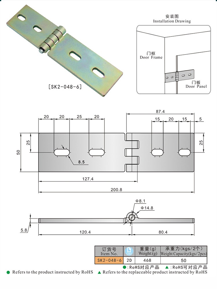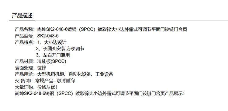 尚坤SK2-048-6铸钢(SPCC)镀彩锌大小边外露式可调节平面门铰链门合页